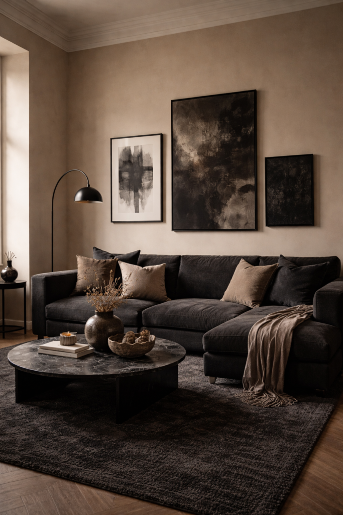 Dark sofa + dark rug + dark artwork grouped together creates a visual weight pocket. This makes one area feel heavier than the rest of the room.