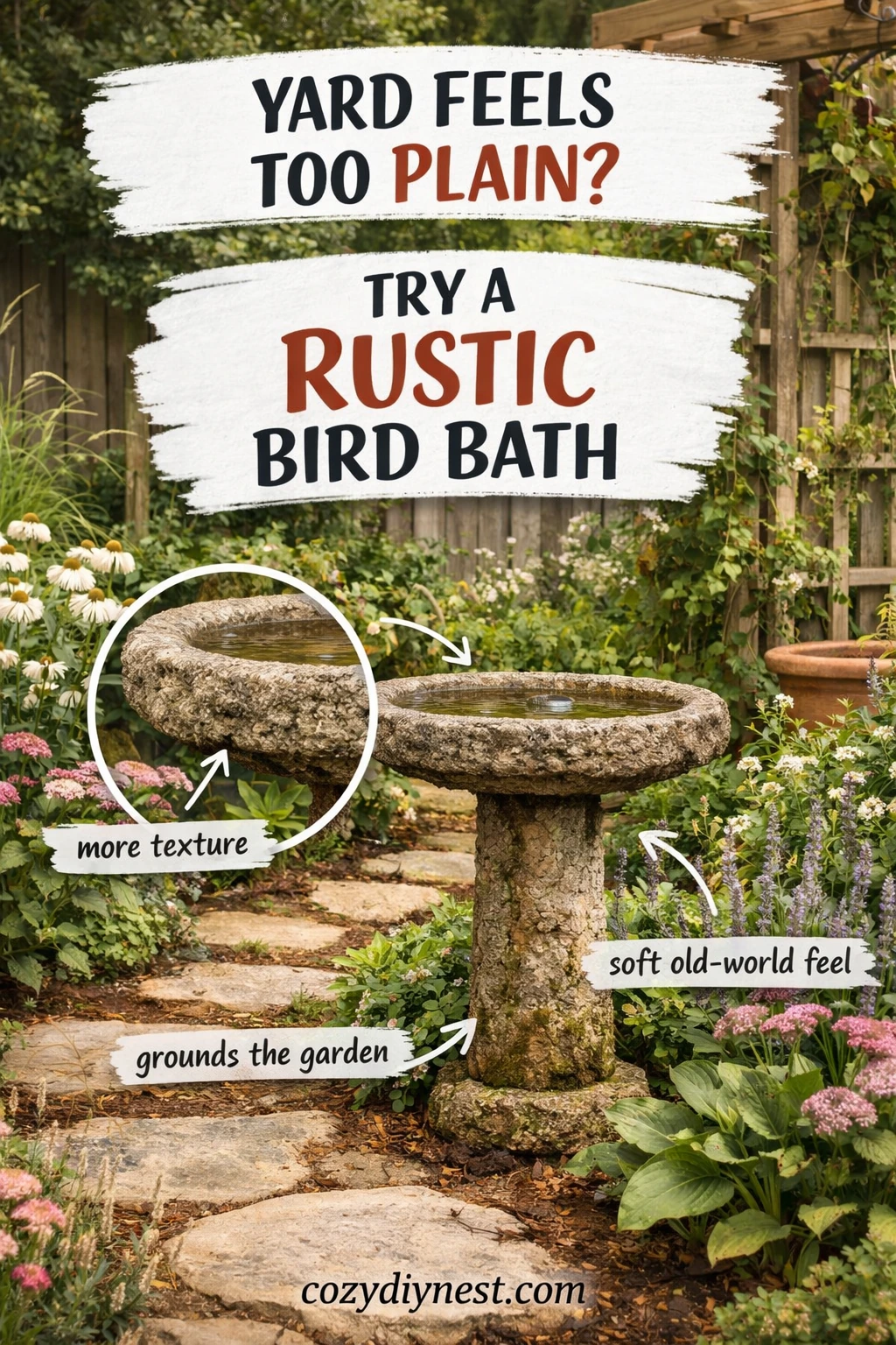 Material matters more than people expect. Some bird bath ideas work not because of size or placement alone, but because the finish gives the garden more warmth and texture. If your yard feels too plain or too clean-lined, a weathered or rustic style can make the whole space feel more rooted.
