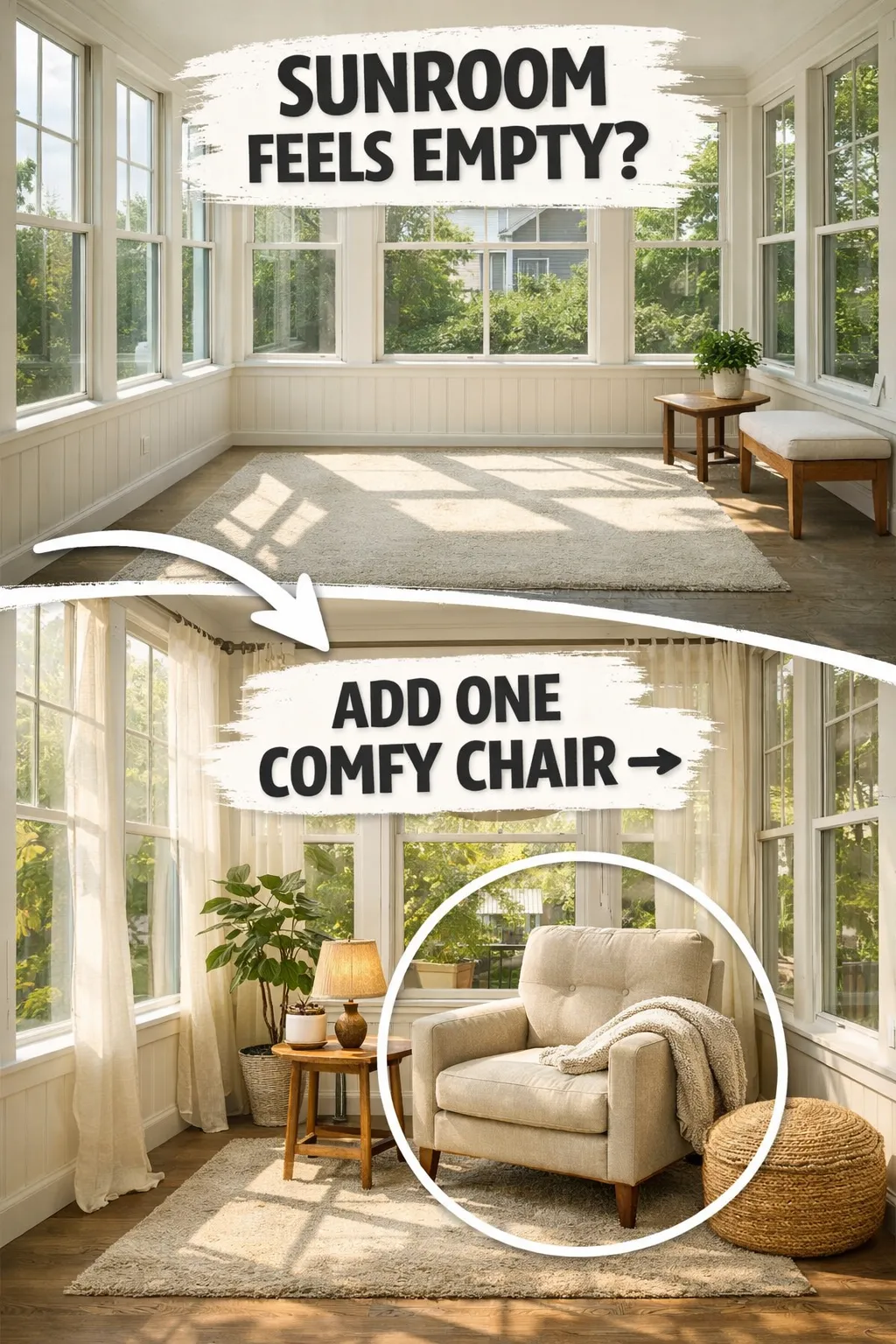 A bright room often feels incomplete simply because there is nowhere irresistible to sit. A sunroom needs at least one piece that invites you to stay.