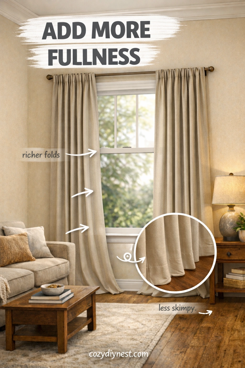 This is another practical answer to how to make curtains look expensive. If the curtains feel thin, sometimes the issue is not only the fabric weight but also the lack of fullness. More total fabric creates deeper folds and a richer silhouette.