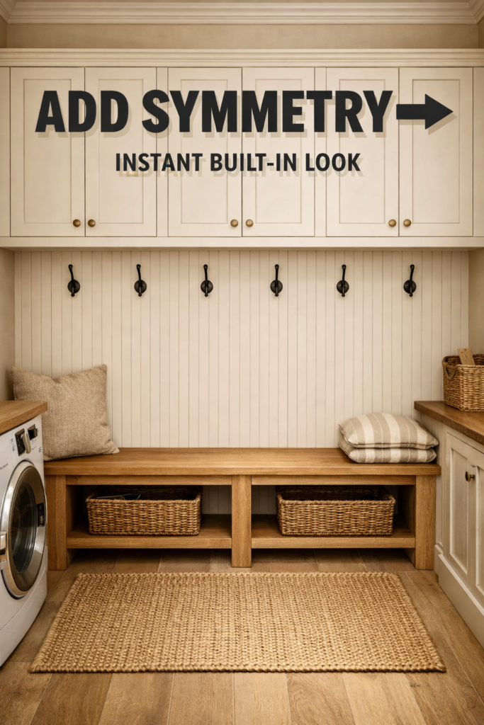 Symmetry instantly signals intention. When upper cabinets align with hooks and benches sit centered below, your eye reads the layout as architectural — not improvised.