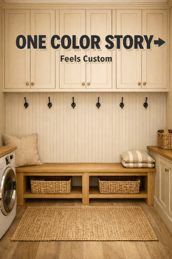 Built-in spaces feel elevated because materials repeat. Choose one warm neutral palette and carry it across cabinetry, baskets, and trim.