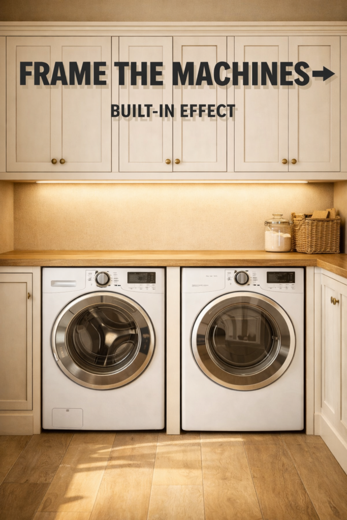 A countertop above front-loaders visually connects appliances to surrounding cabinetry.