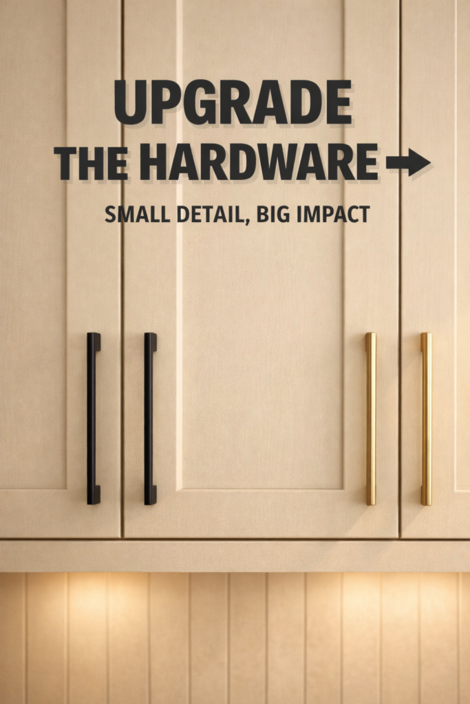 Cabinet hardware acts like jewelry. Swapping basic pulls for elongated matte or brushed finishes instantly elevates the space.