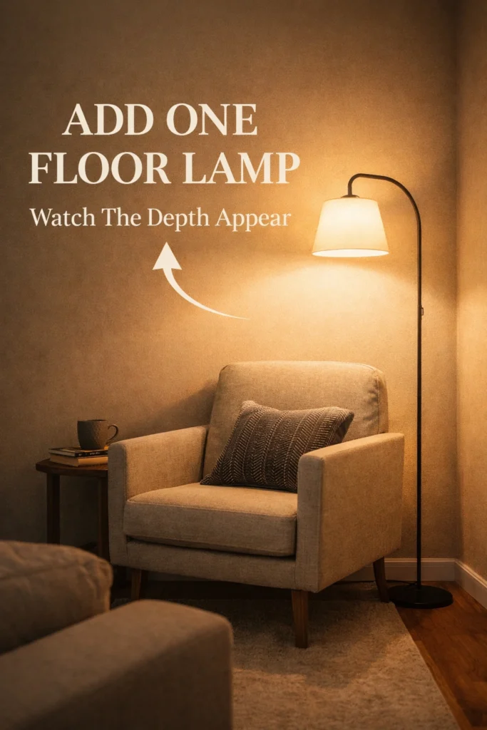 A single floor lamp placed behind a chair creates depth. Why? Because light hitting the wall behind furniture extends the eye backward.