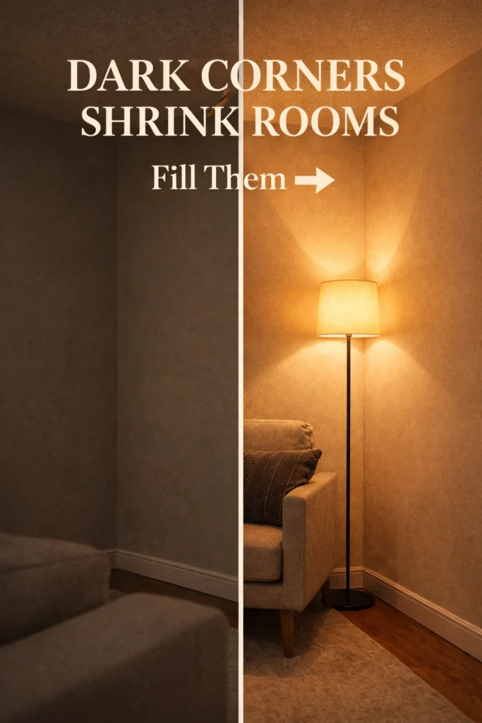 Dark corners visually shrink a room. A tall slim lamp in one empty corner prevents the eye from stopping abruptly at shadow edges.
