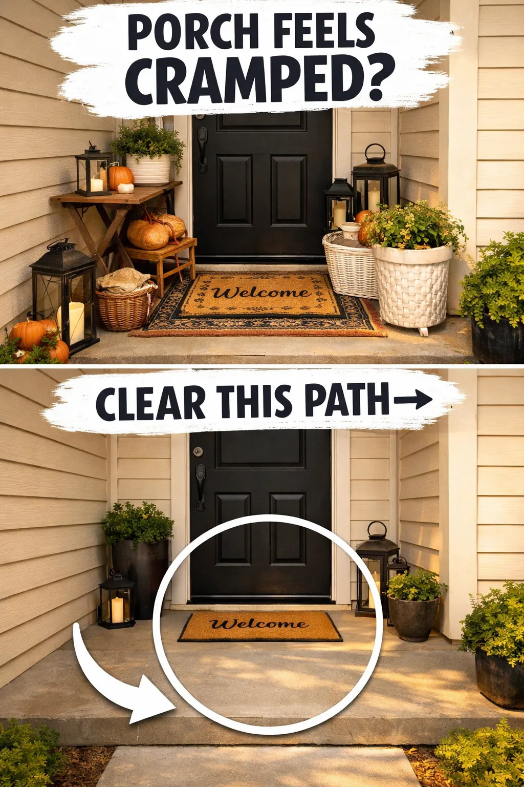 One of the biggest reasons a small porch feels stressful is that the walking path is too crowded. If you have to step around planters, squeeze past furniture, or visually fight your way to the door, the entry will always feel smaller than it really is.