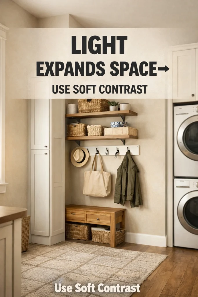 One of the most powerful small laundry mud room ideas is shifting storage off the floor. When baskets, bins, and shoes spread across the ground, your walking path shrinks visually and physically.
