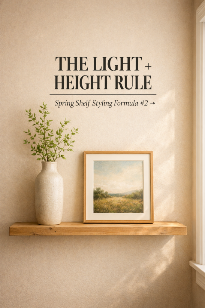 Spring shelf styling isn’t about minimalism. It’s about clarity. Remove weight, introduce air, add glow — and your space feels new again.