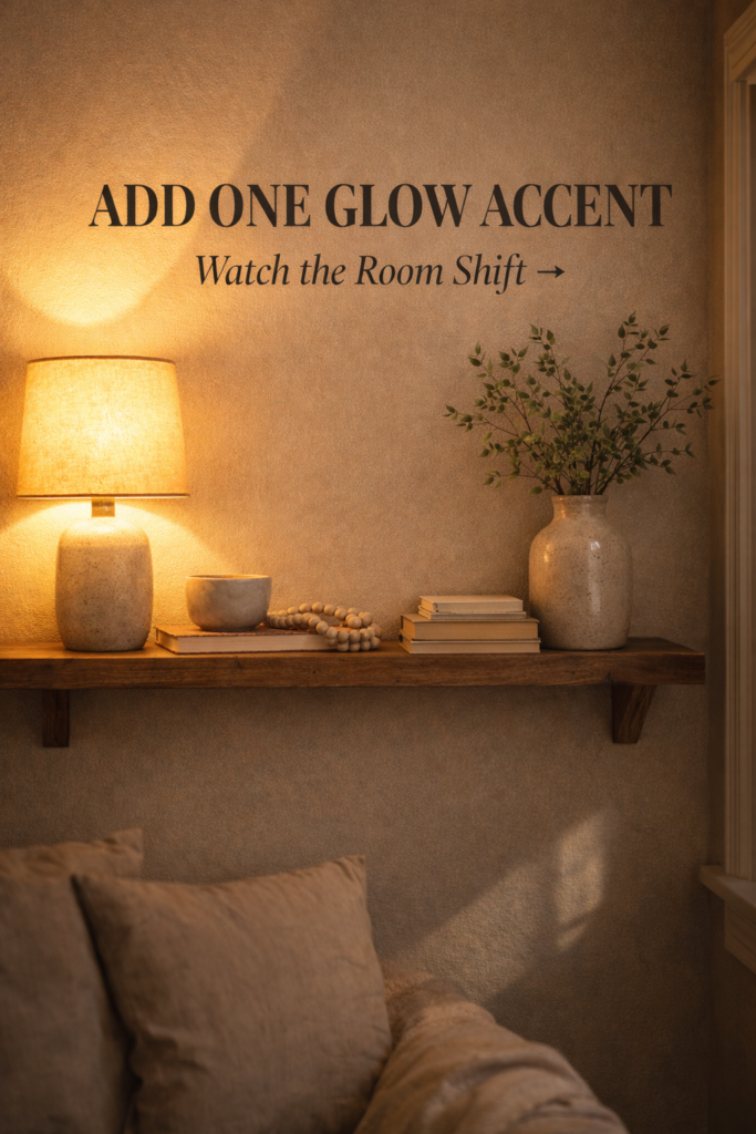 Add a subtle warm light source near or above the shelf. A small table lamp, LED picture light, or candle accent softens shadows and creates depth. According to Architectural Digest, layered lighting dramatically improves spatial warmth and visual comfort.